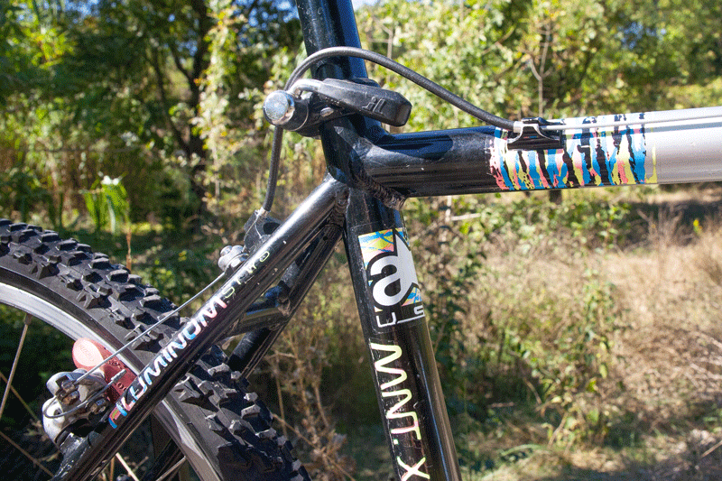 Comme son nom l’indique, tout est méga dessus. Méga-tubes presque aussi gros que chez Klein ou Cannondale, méga tube de selle et méga douille de direction au format « Evolution » 1″1/4 développé par Fisher (N’oublions pas que Bill Stevenson fut auparavant designer chez Fisher). La fourche en acier cromo est droite et oversized. Côté géométrie, on est proche des productions de Gary Fisher avec des tubes supérieurs pas trop long et des angles de direction à 70°. Par contre l’arrière est très court : 419mm. En gros, méga tubes et géométrie compacte, ça va tabasser sévère sur la caillasse !