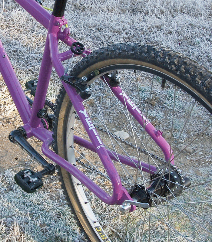 Le lecteur avisé aura noté un anachronisme sur le vélo présenté. Le tendeur de chaîne est moderne et le SingleSpeed est considéré comme une pratique plutôt récente. Mais pour apprécier le comportement d’un Yeti FRO, rien de tel qu’une transmission sans vitesse dans le pur esprit BMX, nécessitant relances, maniabilités et montés d’adrénaline ! Sinon, son montage est cohérent avec l’année 92 : Freinage Shimano XT M732, pédalier Cook Bros, jeu de direction Chris King 1″ 1/4 reliant le cadre à une fourche Accutrax. Siglée Answer, cette fourche très BMX a été développée par Frank Wadelton pour Yeti. Dans la foulée, on note aussi la potence Answer A-Tac, elle aussi créée par Frank Wadelton et son cintre Taperlite.