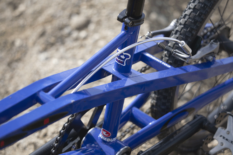 Ce qui fonctionne sur un VTT doit aussi fonctionner sur un BMX. Ce BMX prototype en est la parfaite illustration. Son cadre périmétrique est directement issu du Radical plus de descente de Nicolas Vouilloz et reprend les même tubes acier Columbus. Seul 4 exemplaires seront réalisés dans ce matériau mais jugés trop lourd par les pilotes du Team, Sunn déclinera ce design en aluminium. Pour fixer la roue arrière, Sunn choisit une technique initiée par Ibis, Ritchey et Breezer : la patte coquille, plus rigide mais aussi plus facile à souder sur les bases et haubans. La fourche Bogota en Cromo 4130 est segmentée comme celle du Fat Chance Yo Eddy et reçoit une douille de direction 1/8”, aheadset, standard aussi développée en VTT. Depuis 1996, tout freinage VTT qui se respecte utilise des étriers V brakes, plus puissants et idéaux sur les petits cadres pour leur faible encombrement latéral. Ici un ensemble Avid 2.0 des plus simples et efficaces. Les disques ne tarderont pas à apparaître sur les BMX dans les années qui suivront. Pour les roues, Mavic était le nec plus ultra de l’époque. À l’image des Crossmax VTT ou des Ksyrium de route, L’équipementier français proposera même des roues de BMX complètes les Xixix,